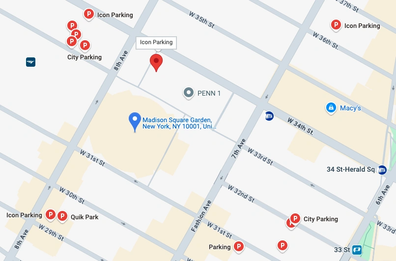 - Commercial parking garages: Numerous garages are located within a few blocks of MSG, particularly around Penn Station and Midtown Manhattan. Popular operators include Icon Parking and independent facilities on West 31st Street, West 33rd Street, 8th Avenue, and 9th Avenue.